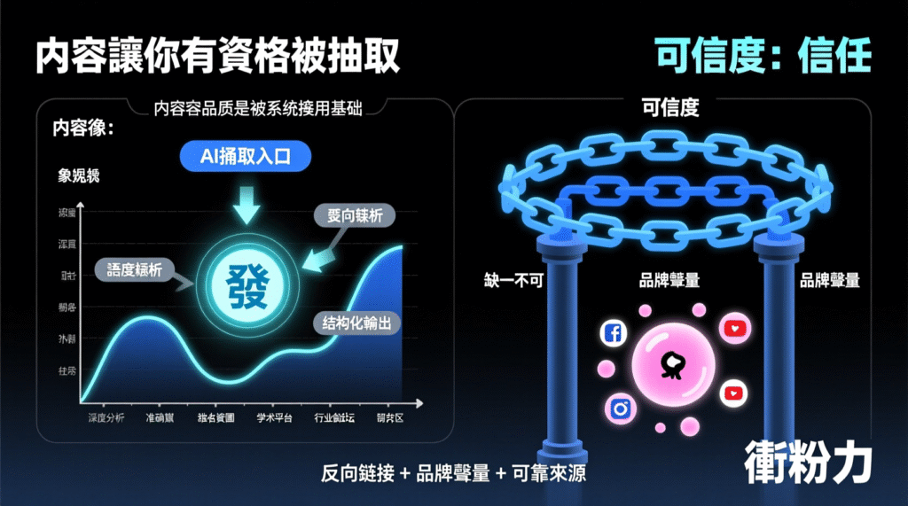「AI 會引用你的內容,需要三個條件:權威度、品牌信號、內容可抽取。」